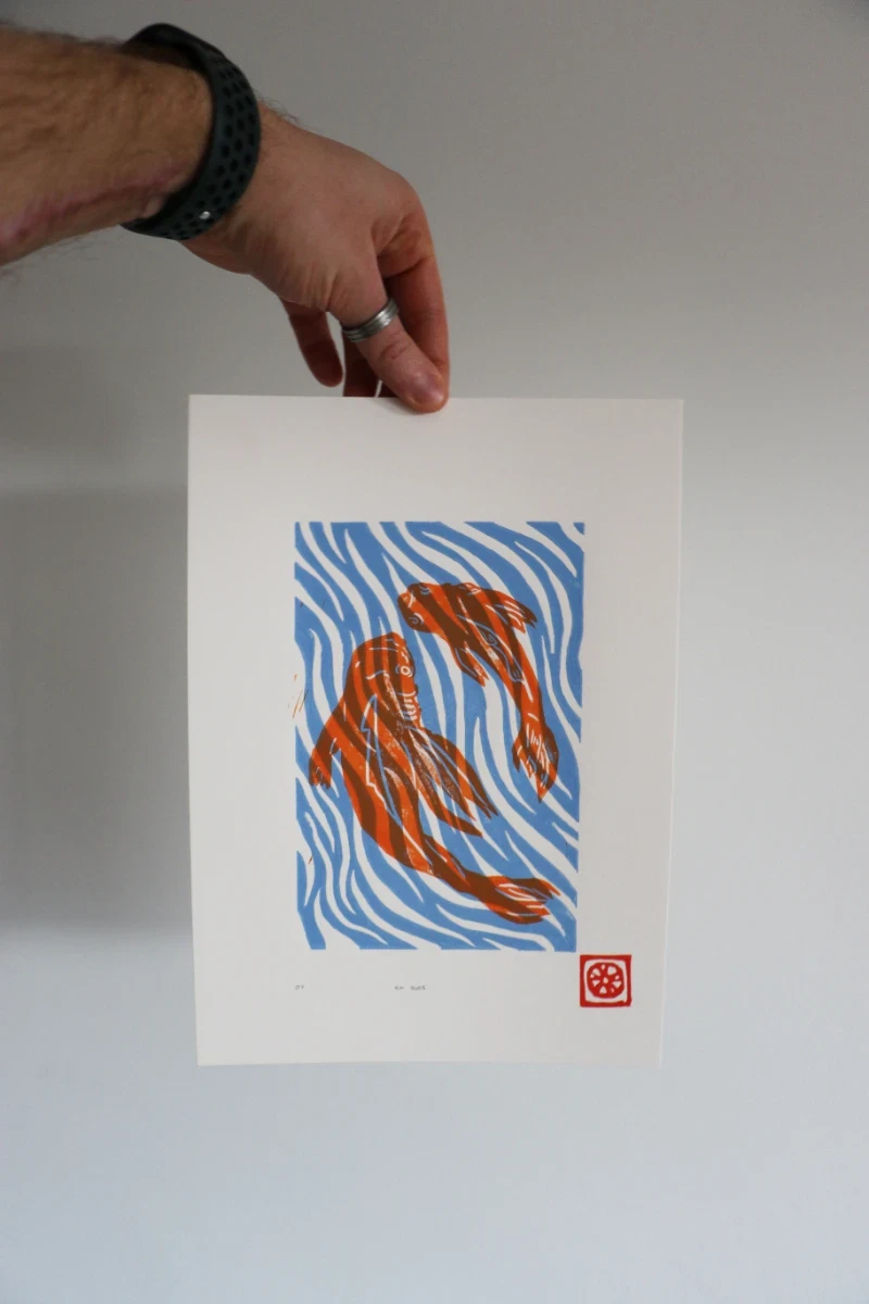 2 colour hand-printed original linocut, A4.